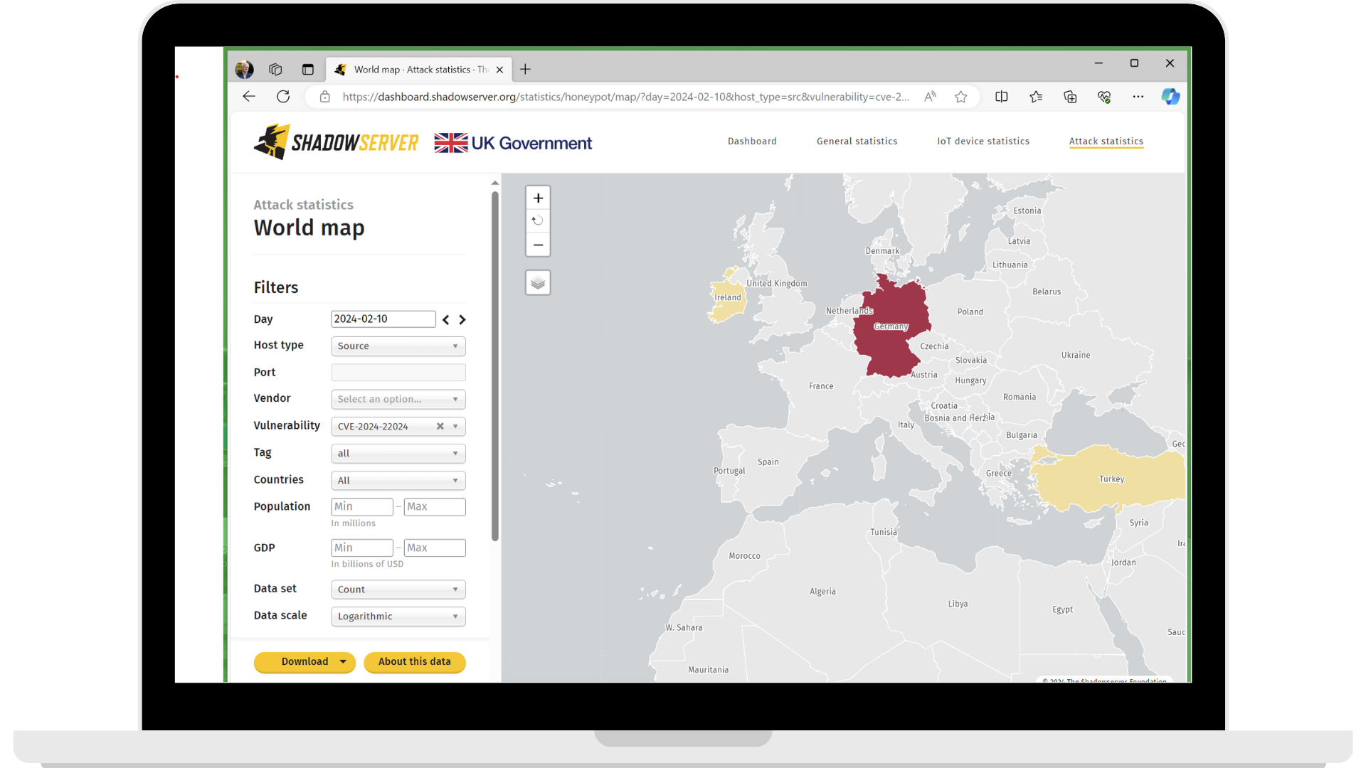 But no need to relax just yet. According to Shadow server honeypot attack statistics at the time of writing, attackers were actively probing for this vulnerability on February 10th, and in the EU especially in Germany.